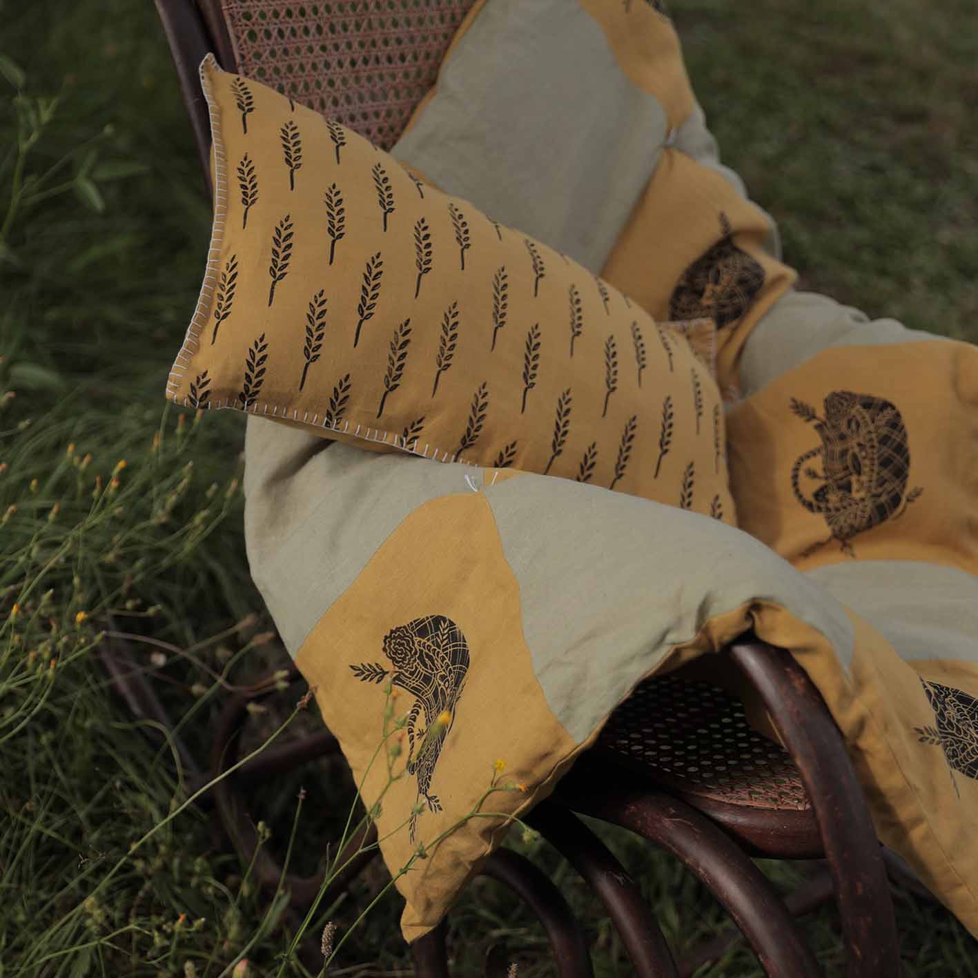 À l’atelier, le fait main est mis à l’honneur. Nos tissus en lin sont imprimés à la main au tampon.