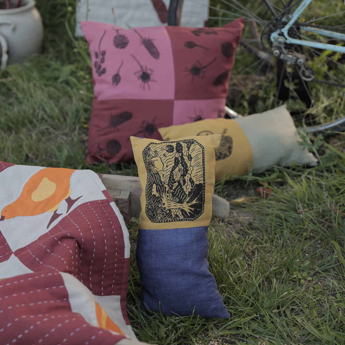 Impression manuelle : qui consiste à graver à la main des tampons à partir de mes dessins afin de réaliser des impressions manuelles qui confèrent un caractère unique au tissu. Cette technique permet d’utiliser des tissus naturels neufs mais aussi de récupération.